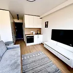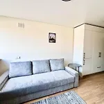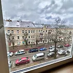 Brand New Studio In The Center俯瞰着城市,仅需6分钟即可到达维尔纽斯的Maxima XXX. 住所是一家公寓,设有大厨房,配有所有必要的餐具.